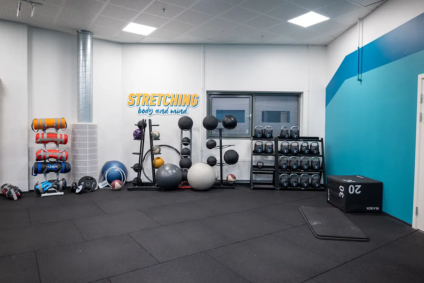 I udstrækningsområdet finder du ribber, måtter, pilatesbolde, små vægte, mavehjul, Bosu bolde, forskellige slags elastikker og foamrollere.