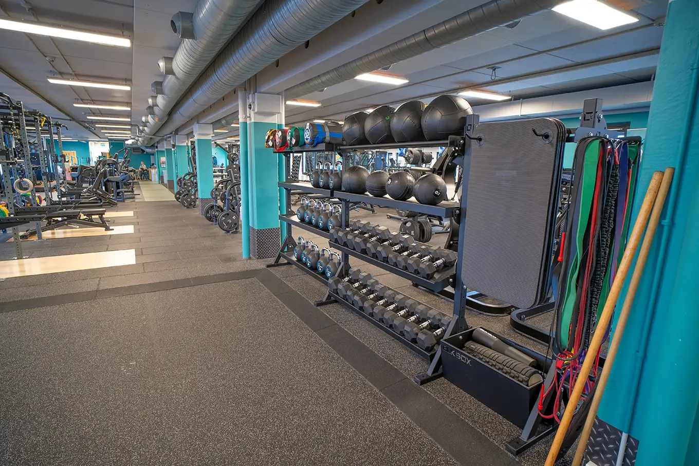I udstrækningsområdet finder du ribber, måtter, pilatesbolde, små vægte, mavehjul, Bosu bolde, forskellige slags elastikker og foamrollere.