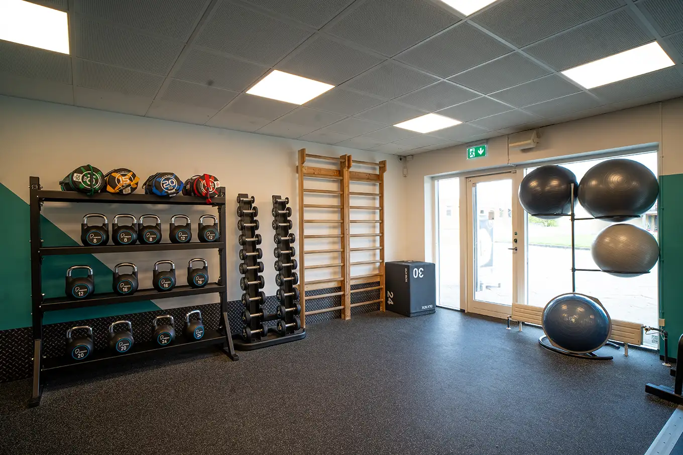 I udstrækningsområdet finder du ribber, måtter, pilatesbolde, små vægte, mavehjul, Bosu bolde, forskellige slags elastikker og foamrollere.